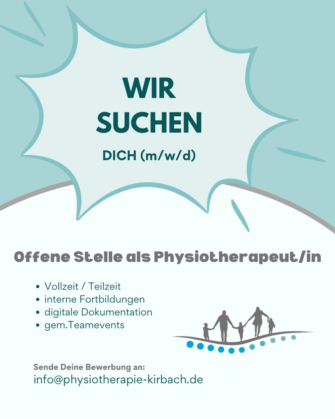 Kontakt aufnehmen Telefon: 0203 - 72975862 | Email: info@physiotherapie-kirbach.de | Stellenangebote